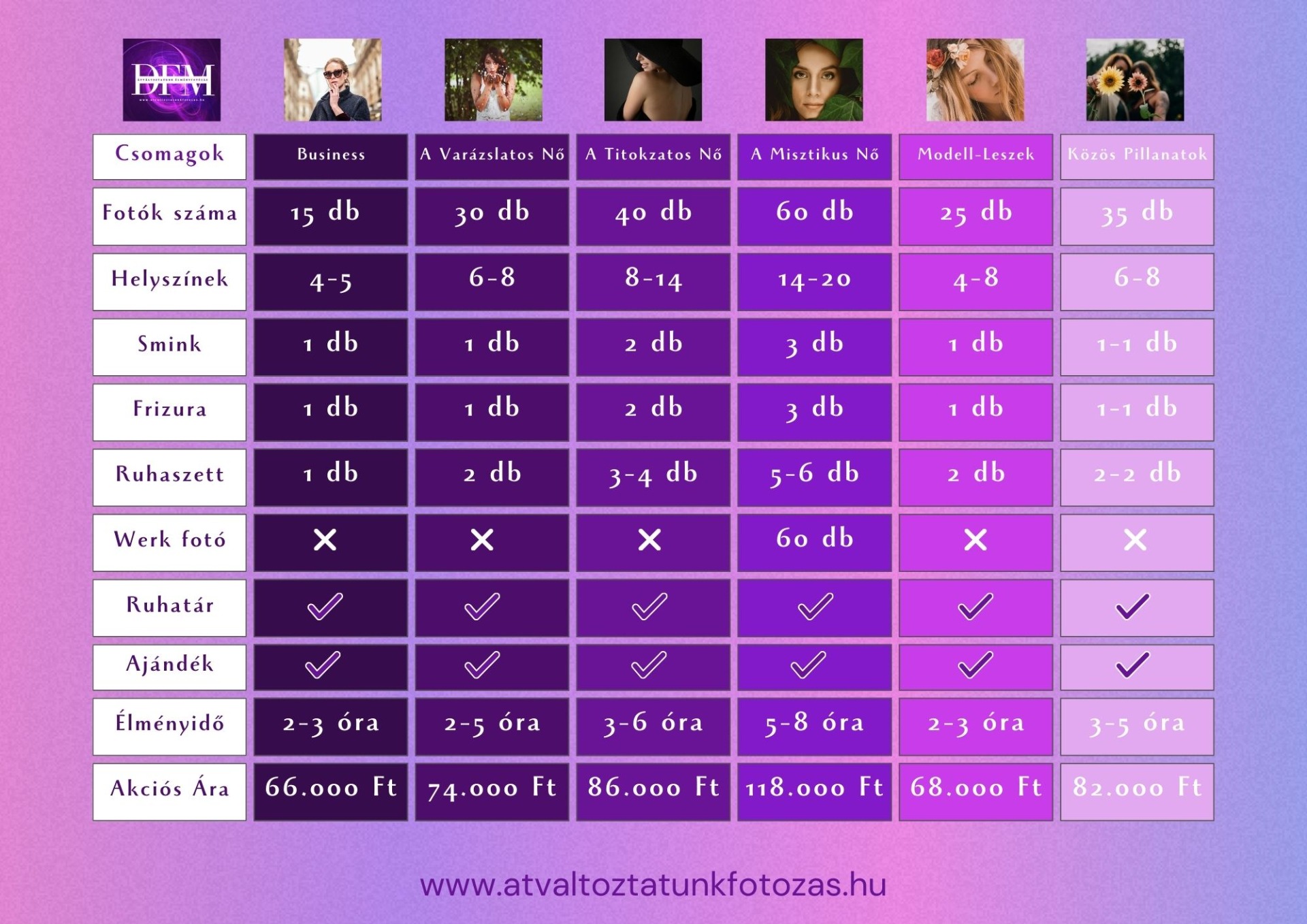 Fedezd fel élményfotózási csomagjainkat, és találd meg azt, amely a leginkább hozzád illik! Táblázatunk segítségével könnyedén összehasonlíthatod az elérhető lehetőségeket.