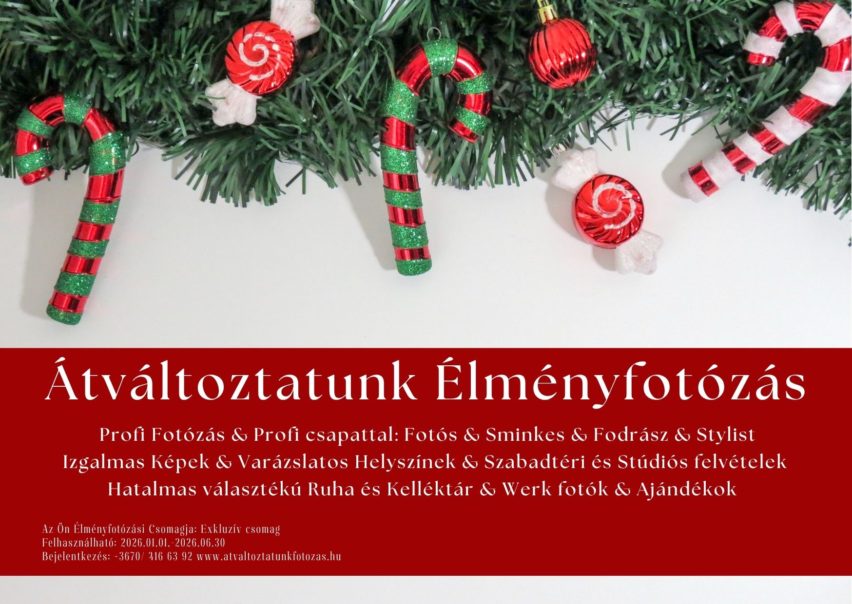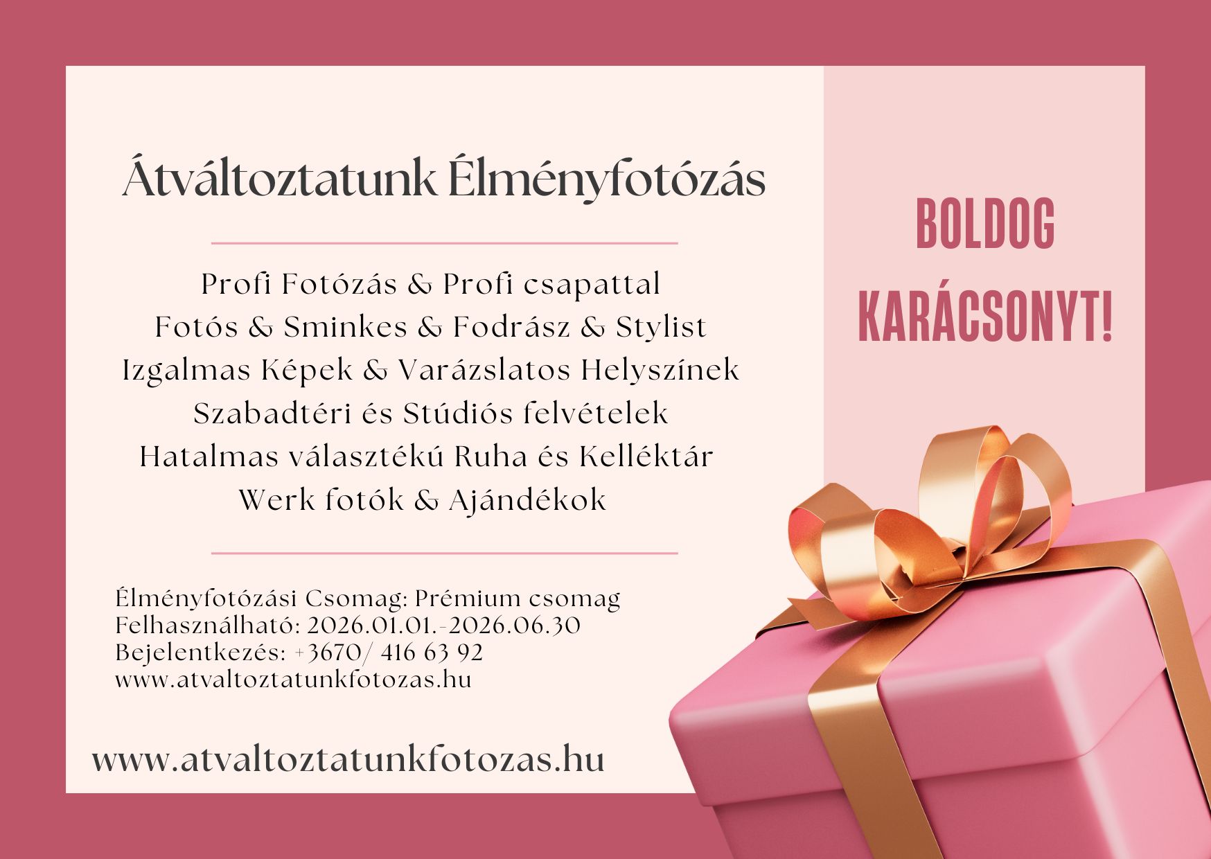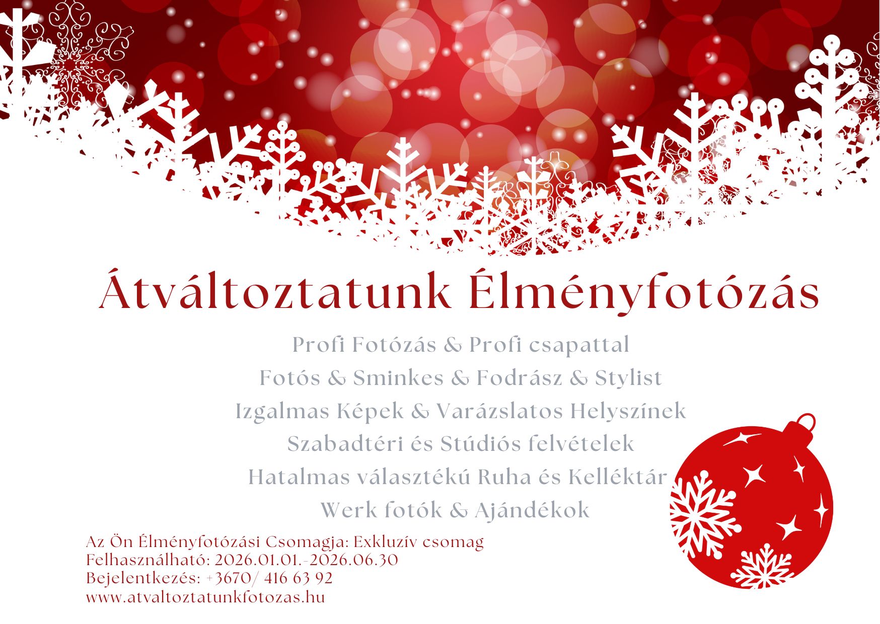 A karácsonyi designnal készült névre szóló ajándékutalványok 2025.12.20-ig rendelhetők, e-mailen kerülnek elküldésre. Az utalványok 2026.01.01-től (6 hónapig) beválthatók egy Exkluzív, Testet & Lelket megújító Élményfotózásra, ahol Profi Fotós & Sminkes & Fodrász & Stylist & Szabadtéri és Stúdiós képek & Hatalmas választékú Ruha és Kelléktár várja majd a Hölgyeket.
