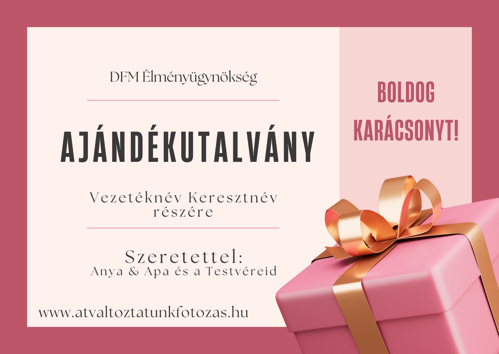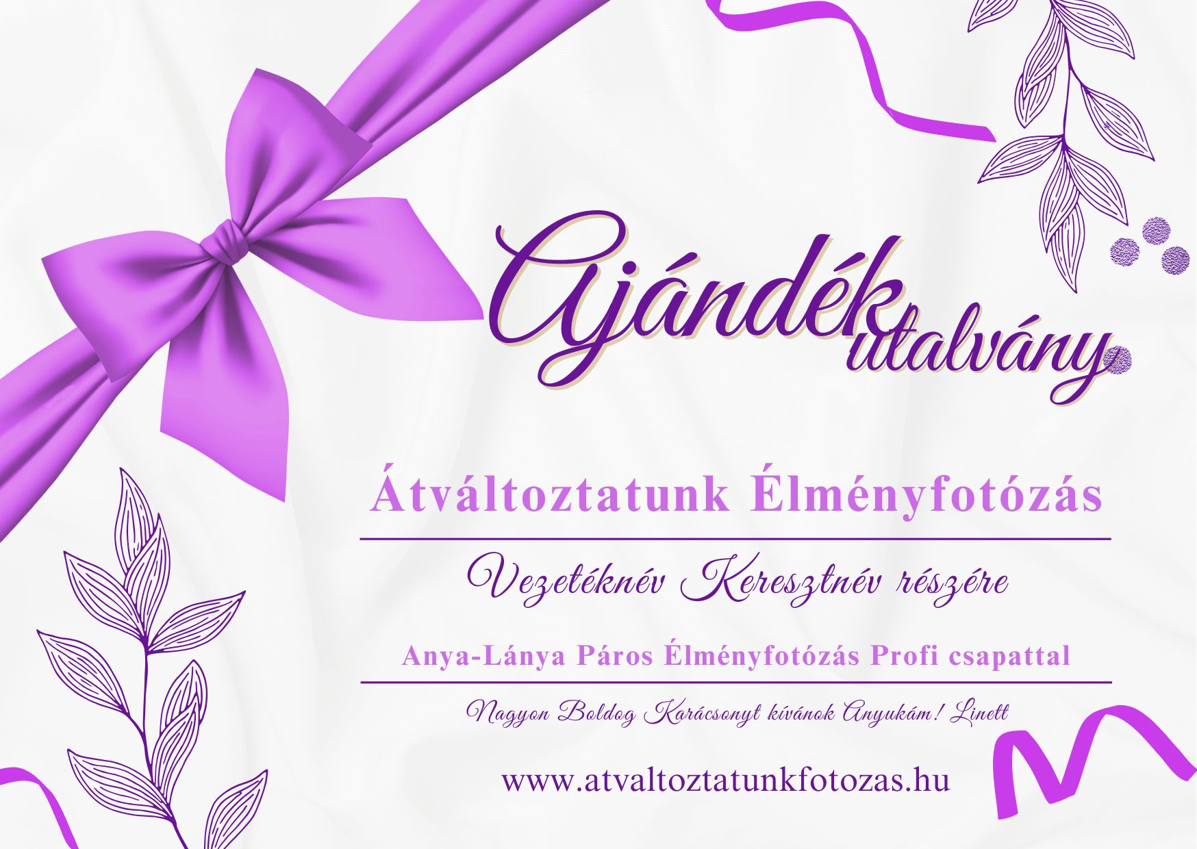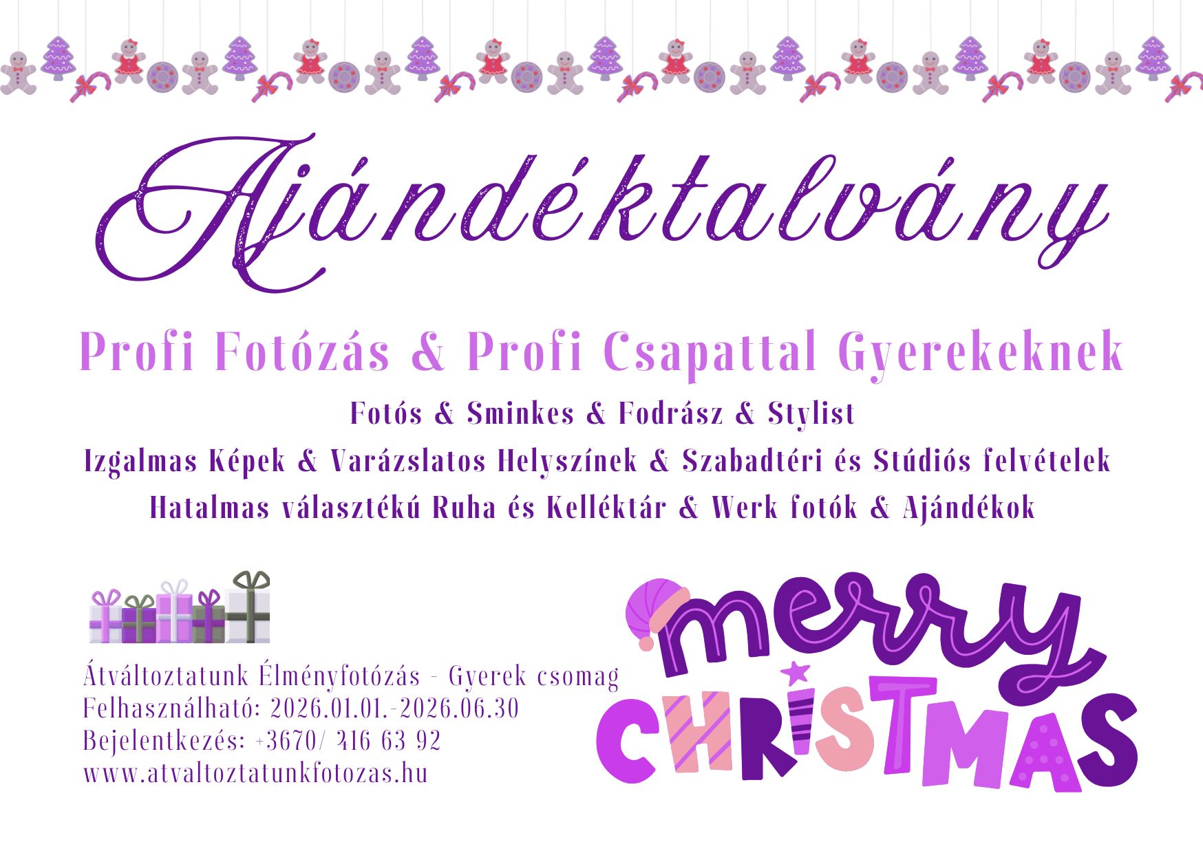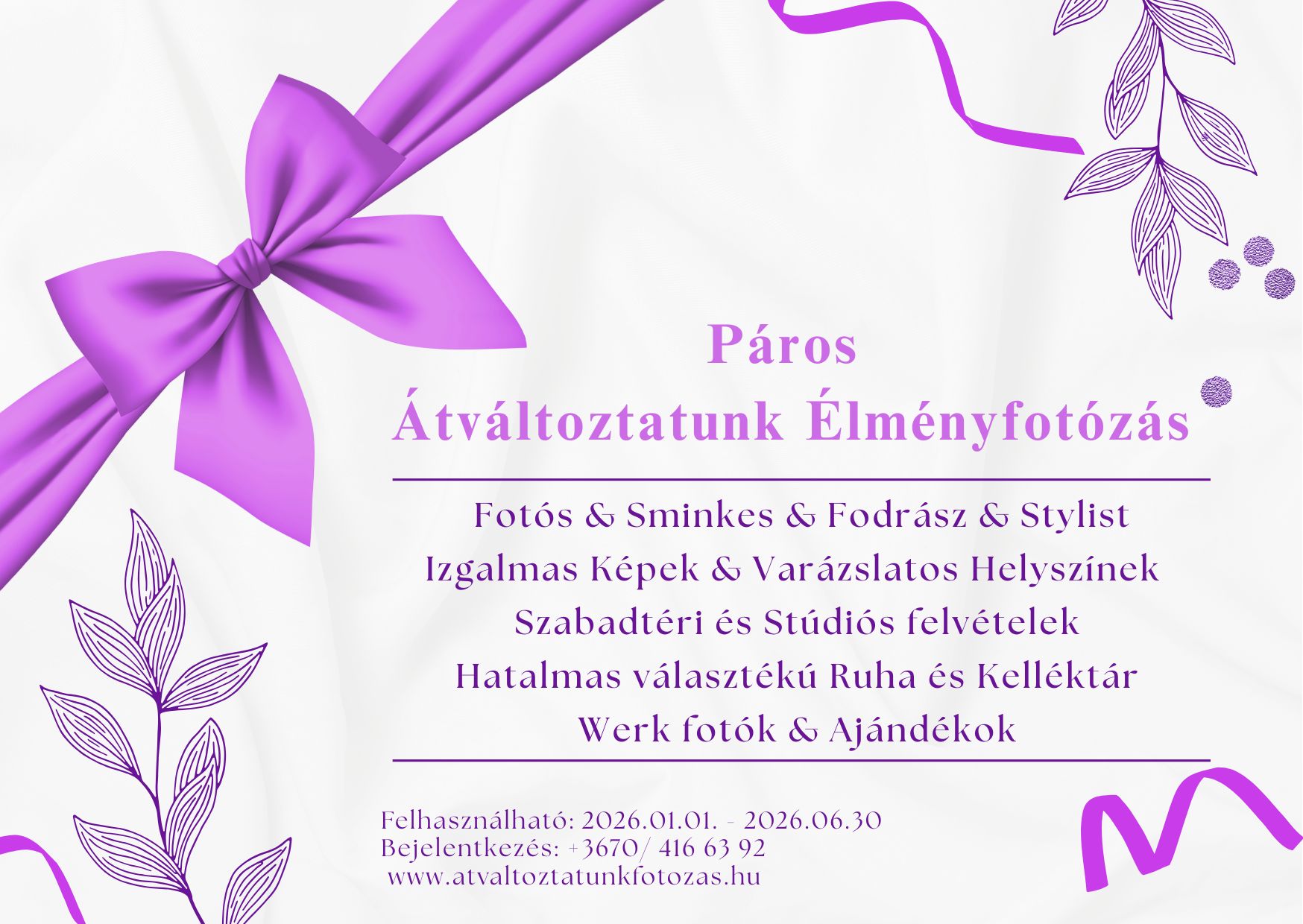 A karácsonyi designnal készült névre szóló ajándékutalványok 2025.12.20-ig rendelhetők, e-mailen kerülnek elküldésre. Az utalványok 2026.01.01-től (6 hónapig) beválthatók egy Exkluzív, Testet & Lelket megújító Élményfotózásra, ahol Profi Fotós & Sminkes & Fodrász & Stylist & Szabadtéri és Stúdiós képek & Hatalmas választékú Ruha és Kelléktár várja majd a Hölgyeket.